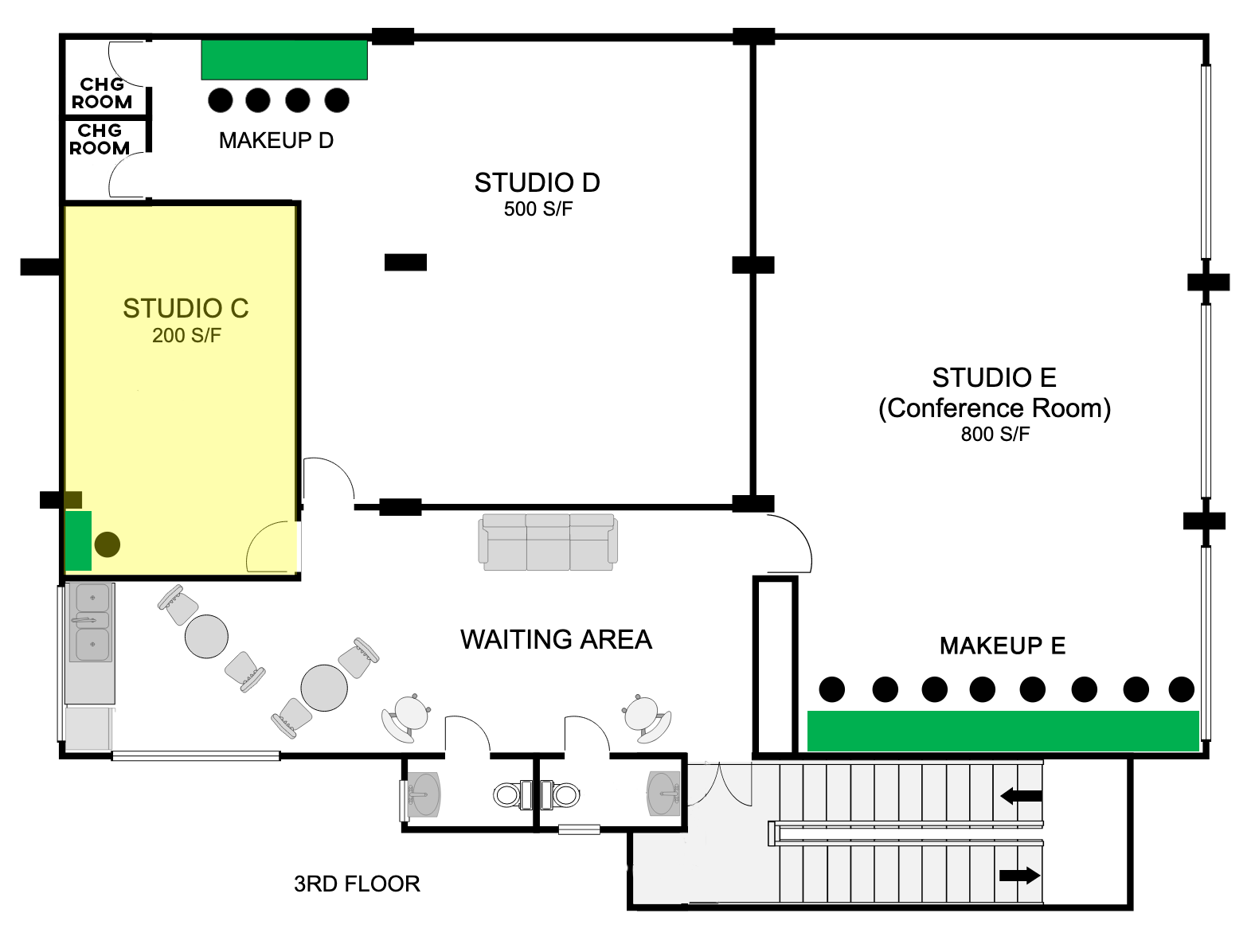 El Studio C cuenta con 220 pies cuadrados de espacio de producción, techos de 10' y ciclorama. Este studio esta pintado completamente de verde "Chroma".